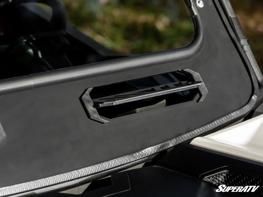 This Can-Am Maverick Sport windshield comes with extra goodies for your comfort. A manual wiper is strategically placed in front of the driver’s seat to keep the mud and rain away. Just move the handle above you to see clearly again. Hot or chilly? Control the airflow by loosening the knobs and sliding the vents open or closed. You can handle both easily without having to stop your wild ride.